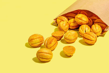 Cookies in the shape of walnuts with condensed milk cream filling. Delicious shortbread sandwiches, modern vegan baking. Trendy hard light, dark shadow, yellow background, copy space