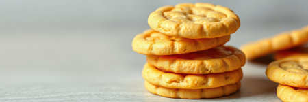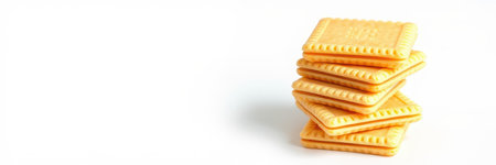Stack of golden cookies arranged neatly on a white background ideal for baking and dessert enthusiasts