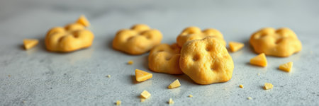 Delicious golden cheese crackers displayed on a surface with scattered cheese chunks nearby