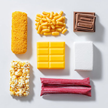 A vibrant display featuring an assortment of snacks and sweets arranged aesthetically on a white background, perfect for culinary visuals and marketing materials.
