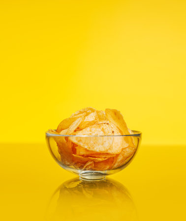 A glass bowl filled with crispy potato chips placed on a vibrant yellow background, creating a bright and appetizing snack scene