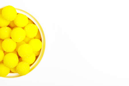 Yellow round candies in a white bowl on a white background. concept of junk food with sugar. sweets concept for kids. sweets store concept. top view, minimalism.