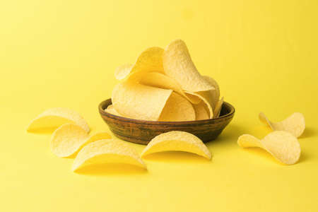 A clay bowl overflowing with potato chips on a yellow background. A popular potato dish.