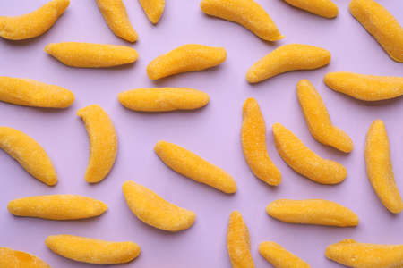 Tasty jelly candies in shape of banana on lilac background, flat lay