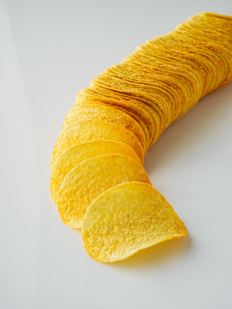 A spread of lightly salted potato chips in various shapes and sizes, isolated against a clean background for contrast.