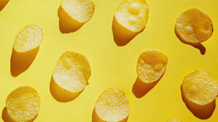 A lot of potatoes chips in line on a yellow background