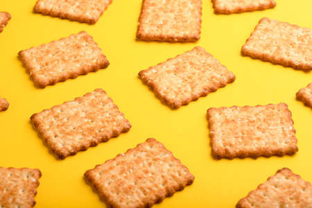 Composition with tasty crackers on yellow background