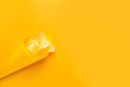 Potato chips snack on yellow background, Crispy potato top view