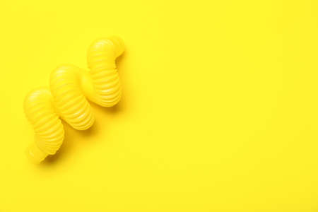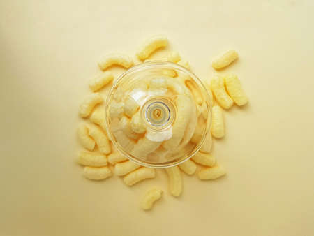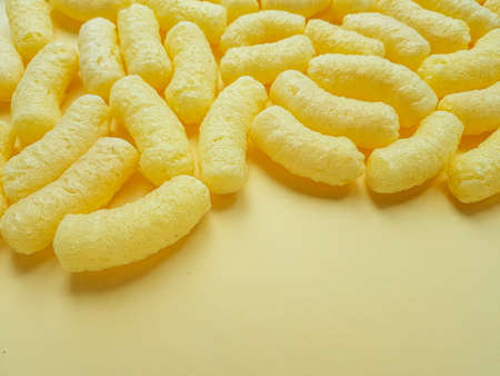 Scattered yellow sweet corn sticks from a glass on a yellow background. Childrens sweets. High quality photo