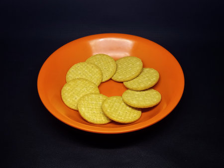Orange plate with round cookies on a black background. Selective focus.