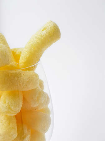 Yellow corn sticks in a transparent glass on a white background. High quality photo