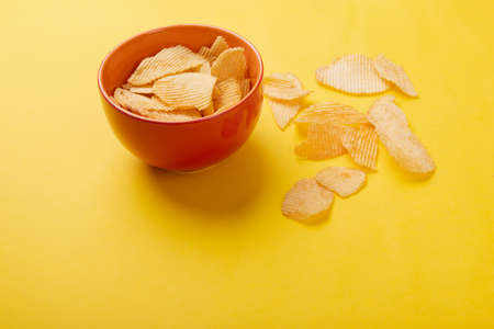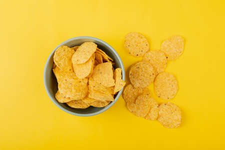 Big bowl with chips on yellow background with copy space for text