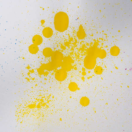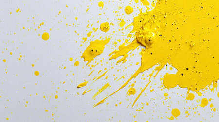 Vivid yellow paint splatters across a clean white canvas create an energetic and bold artistic backdrop ideal for various design projects or creative applications.