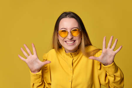 Surprised happy woman in sunglasses on yellow background.
