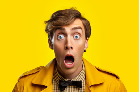 Close-up portrait of a man with a shocked expression against a yellow background. His eyes are wide, and his mouth is open in surprise.