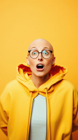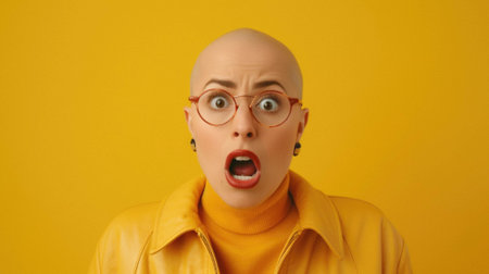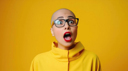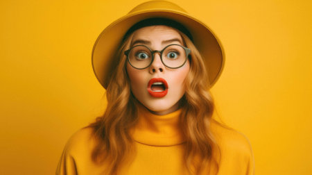Shocked woman with yellow jacket on orange background.