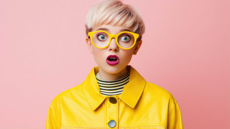 Shocked female in trendy hoodie and jacket looking at camera while standing against yellow background.