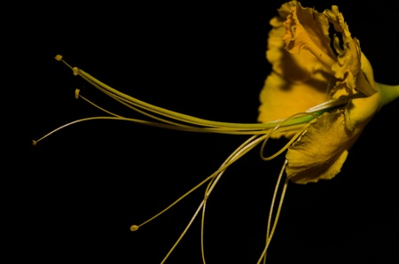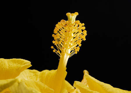 macro photo of a hibiscus flower A macro view of a yellow and red center of a hibiscus flower on black background. The photo shows the details of the flowers stigma .
