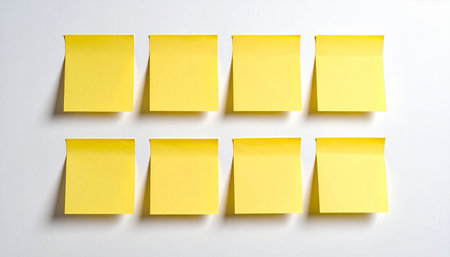 Eight vibrant yellow sticky notes are positioned in two neat rows on a clean white surface, creating a sense of order.