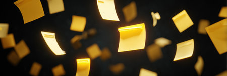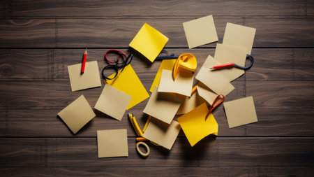 Yellow sticky notes cover a surface in an overlapping, chaotic pattern, creating a visual texture ideal for concepts of organization, creativity, or office work. perfect for designs needing a vibrant, dynamic background., Generative