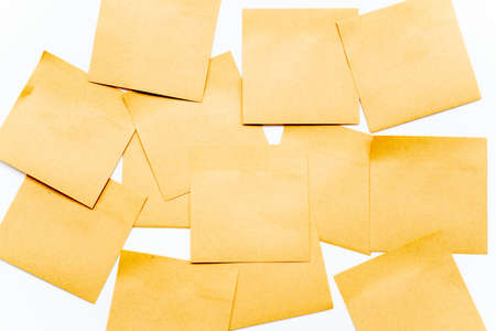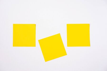 Blank Sticker notes on white background. Sticky note paper mockup. Yellow sticky notes with things to do on office board. Discussing business, teamwork, brainstorming concept