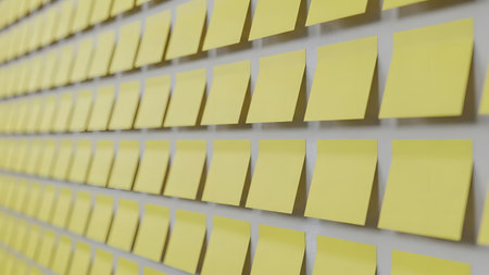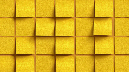 A vibrant arrangement of bright yellow sticky notes on a wall, perfect for brainstorming, reminders, organization, and adding a pop of color to any workspace.