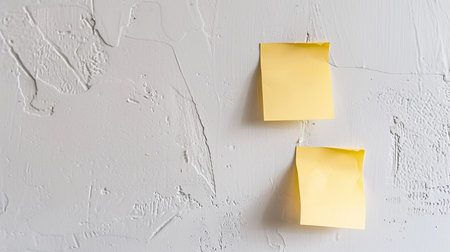 Two yellow sticky notes adhered to a textured wall, casting subtle shadows. Focus on the paper and wall texture.