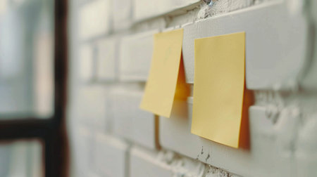 Two blank yellow sticky notes on a textured white brick wall, perfect for notes, reminders, or brainstorming in an office or study setting.