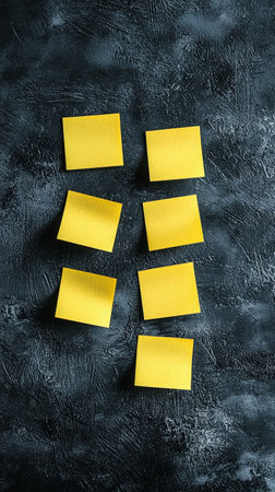 Six yellow sticky notes on textured dark background