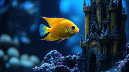 A stunning image featuring a vibrant yellow fish swimming gracefully near an ornate underwater castle. The scene captures the essence of marine life, showcasing beauty and tranquility in beautiful colors and textures.