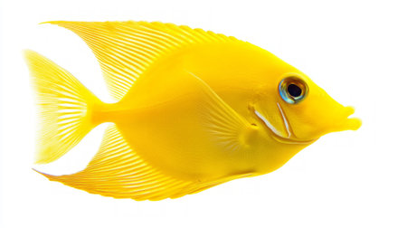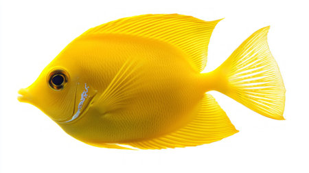 vibrant yellow tang features bright yellow scales and distinct markings beautifully isolated against a white background highlighting its natural beauty and appeal to aquarium lovers.