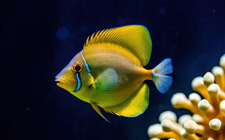 Yellow tropical fish with pattern and coral reef in sea, created using generative ai technology. Fish, animals and nature concept, digitally generated image.