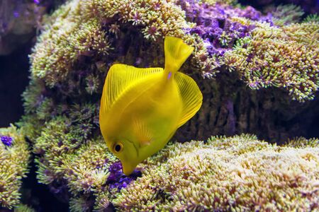 Zebrasoma, yellow surgeonfish. Bright coral reef fish in salt water aquarium.