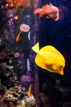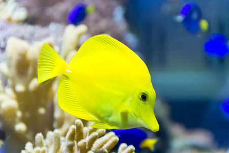 Yellow tropical fish swimming in the blue water of the aquarium with corals.