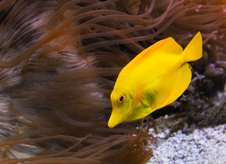 (Zebrasoma flavescens), yellow fish against the background of sea anemones in a marine aquarium