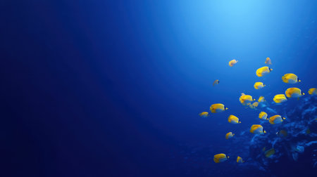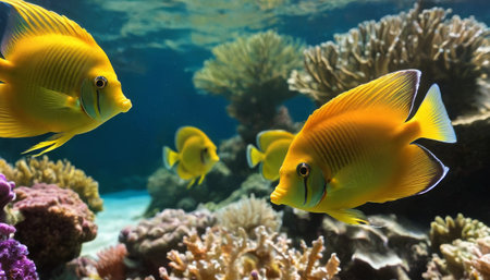 A stunning scene featuring a school of bright yellow tropical fish gracefully swimming through the vibrant blue waters of the ocean, illuminated by soft sunlight.