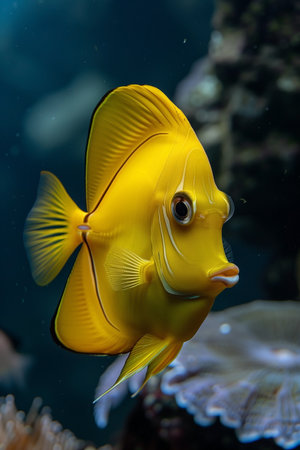Yellow Tang native to coral reefs glides gracefully in clear waters displaying its bright yellow hue and unique body shape. This fish is popular in aquariums.