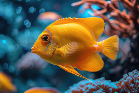 A vivid yellow fish glides among coral formations, showing its vibrant colors. The underwater world busts with life, creating a stunning display of marine biodiversity..