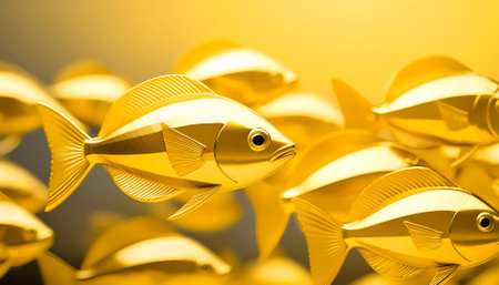 AI generated image showing swimming golden fishes in golden ambiance