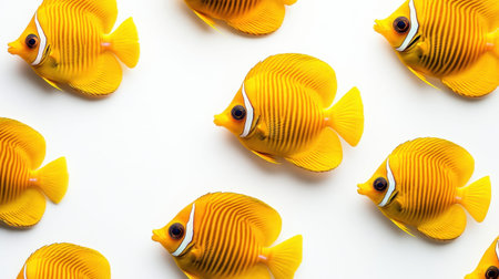 Stunning arrangement of yellow fish against a clean white background, showcasing intricately patterned scales and vibrant colors for a fresh marine aesthetic.