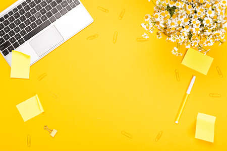 Workspace with keyboard laptop. Top view on a yellow desk