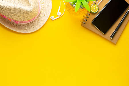 Summer holiday background with straw hat, pineapple drink glass, smartphone, notebook, yellow background, copy space, flat lay.