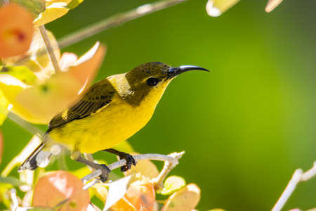 Bird (Olive-backed sunbird, Yellow-bellied sunbird) female yellow color perched on a tree in a nature wild