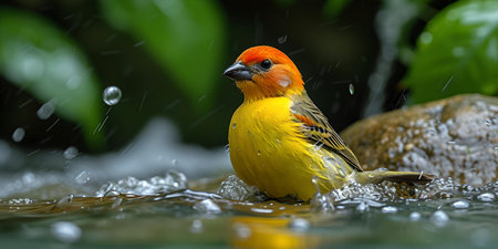 A colorful yellow bird with an orange head enjoys a splash in a water pool surrounded by green foliage. A.I.