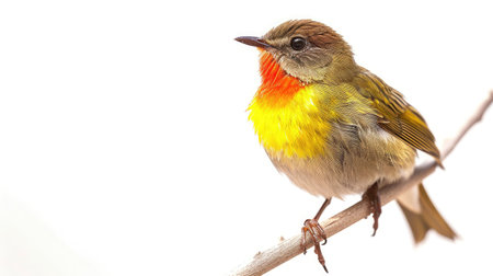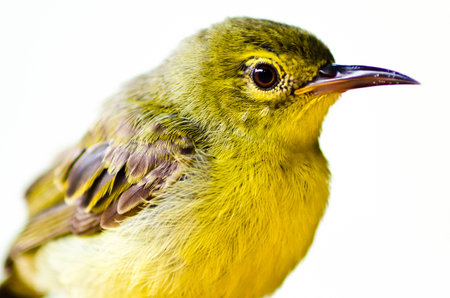 Small bird with yellow feathers on its chest. Looking at the camera on a neutral background.