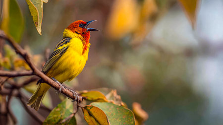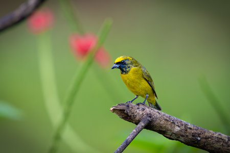 A striking yellow bird with a black head rests on a branch adorned with bright orange flowers. The photograph displays a shallow depth of field, with a soft green background. The lighting suggests a natural outdoor setting, offering potential uses for nature-themed projects, editorial content, and decorative purposes.