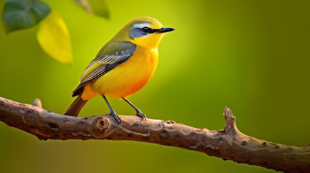 Yellow bird perched on branch of tree with leaves. Generative AI.
