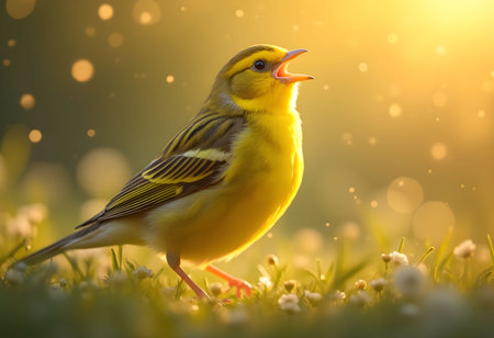 A canary sings joyfully in a sunlit meadow, its glowing feathers contrasting against a dreamy, blurred bokeh backdrop.