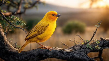 A striking yellow bird is perched on a tree branch, set against a blurred background of green foliage. The avian subject displays bright yellow plumage, complemented by a dark beak. This image, with its natural lighting and focus, is ideal for nature-themed projects, educational content, or illustrative purposes.