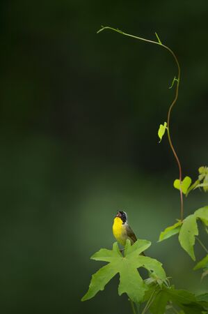 A Common Yellowthroat perched on a large leaf sings out loudly with a smooth green background.